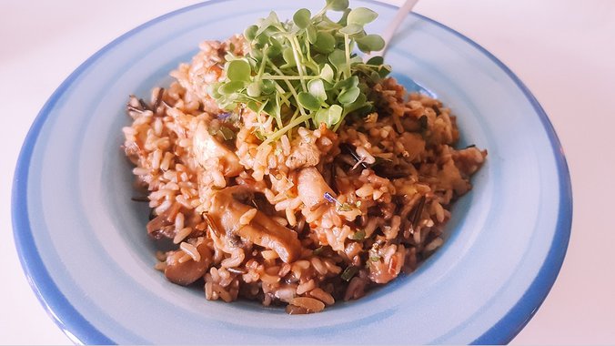 2. U drugoj posudi na maslacu kratko prepržite usitnjen beli luk, dodajte pečurke isečene na trake i vino, pa to dinstajte sve dok ne postanu mekane (oko 15 minuta). U to dodajte gotov pirinač, sitno naseckan peršunov list i po želji posolite i pobiberite.
